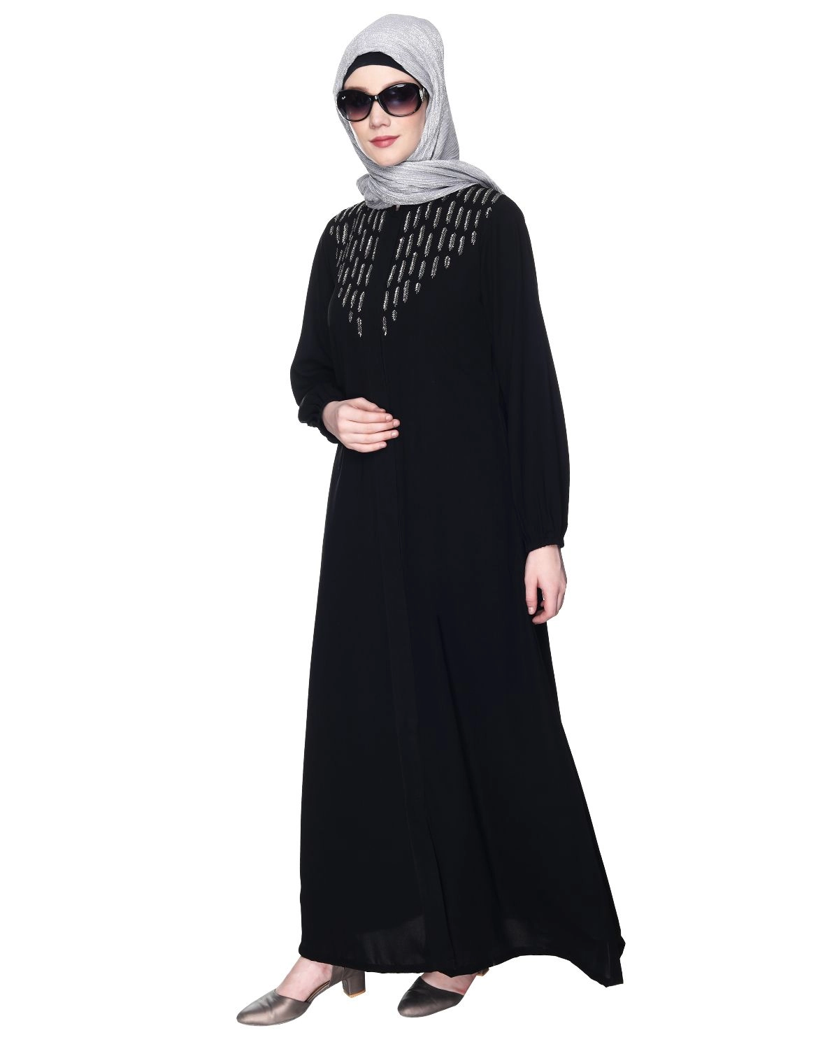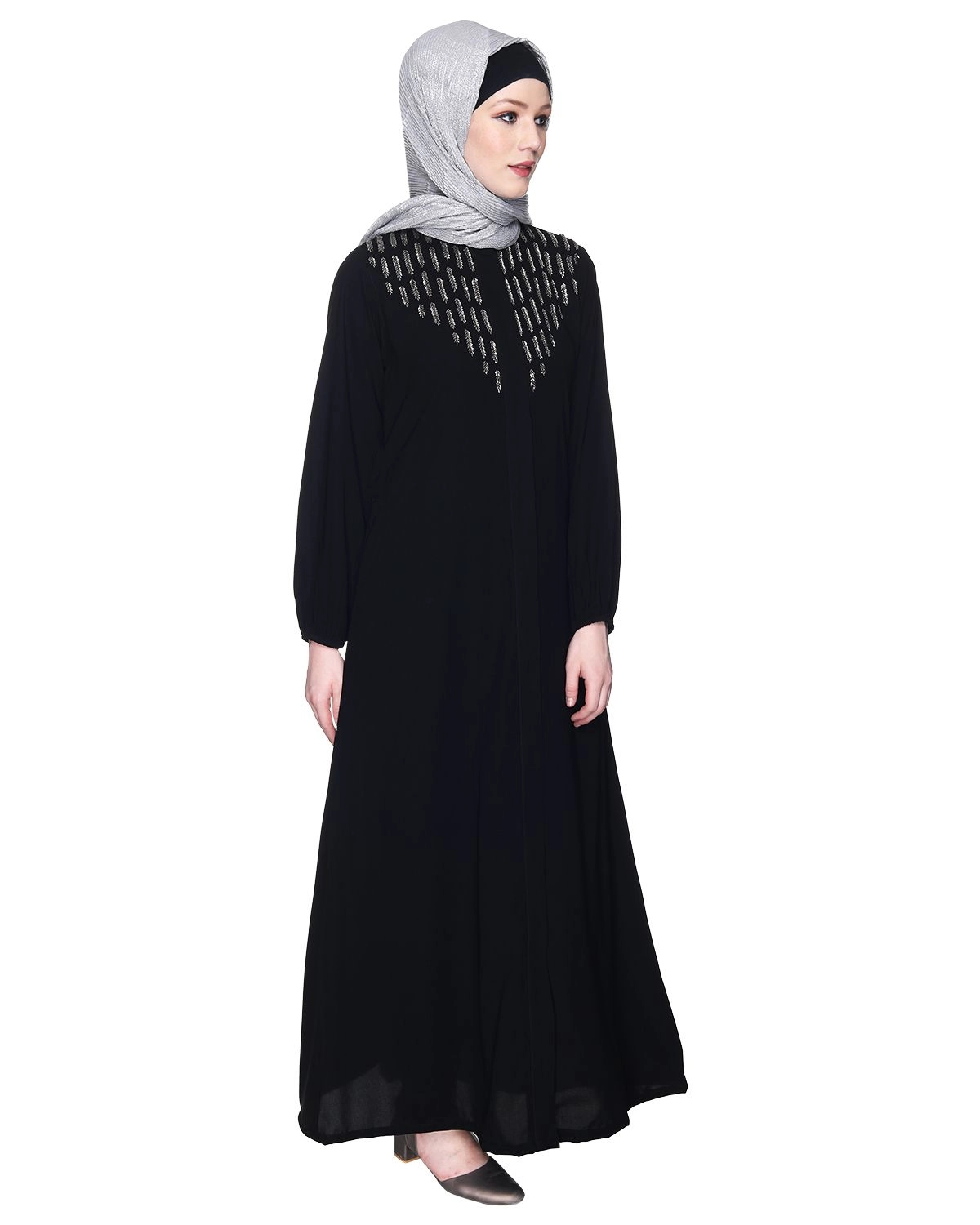Experience the epitome of luxury with our Front Open Abaya, crafted from premium fabric that boasts a rich feel, luxurious texture, and a flowy, opaque silhouette with a magnificent fall. Please note that colors may appear slightly different due to lighting variations. This abaya is adorned with hand-embroidered metal beadwork, showcasing exquisite craftsmanship that truly sets it apart. Elevate your style and embrace the timeless elegance of this Front Open Abaya. Discover the perfect blend of modesty and sophistication in a single garment. Ensure its longevity by following our recommended wash care instructions. Shop now and let the stunning metal beadwork be the highlight of your fashion ensemble.