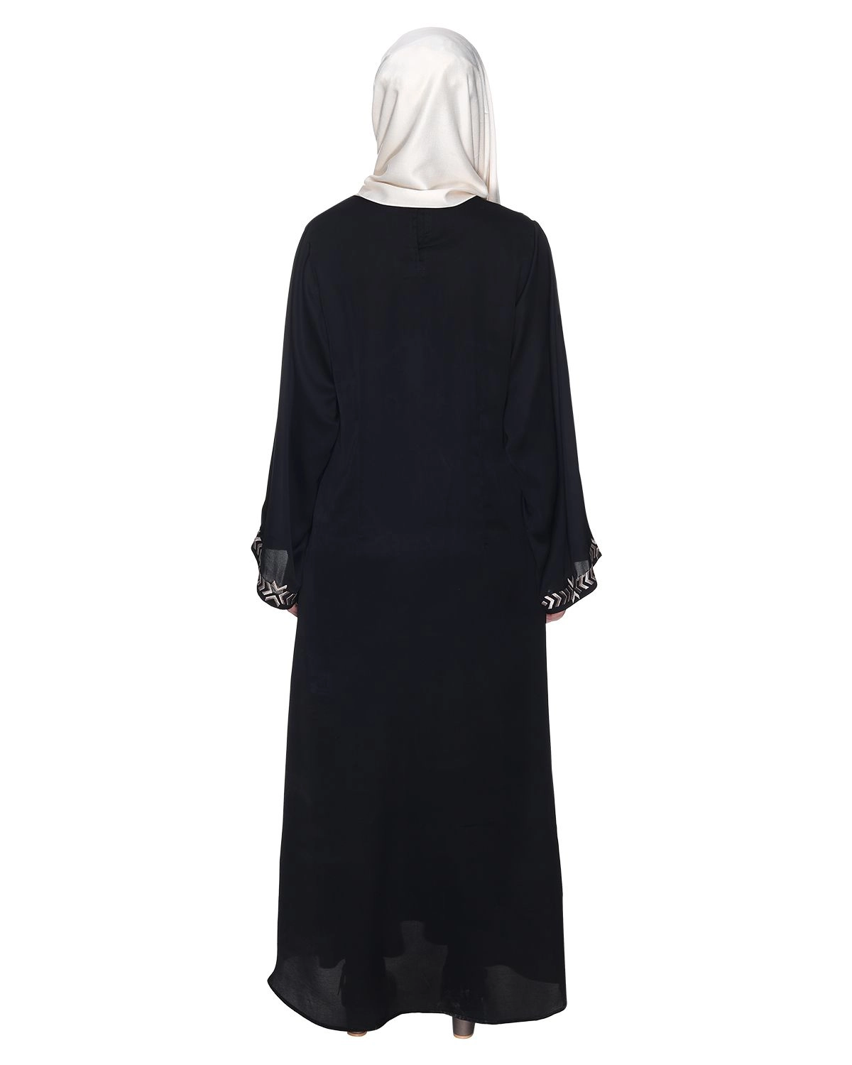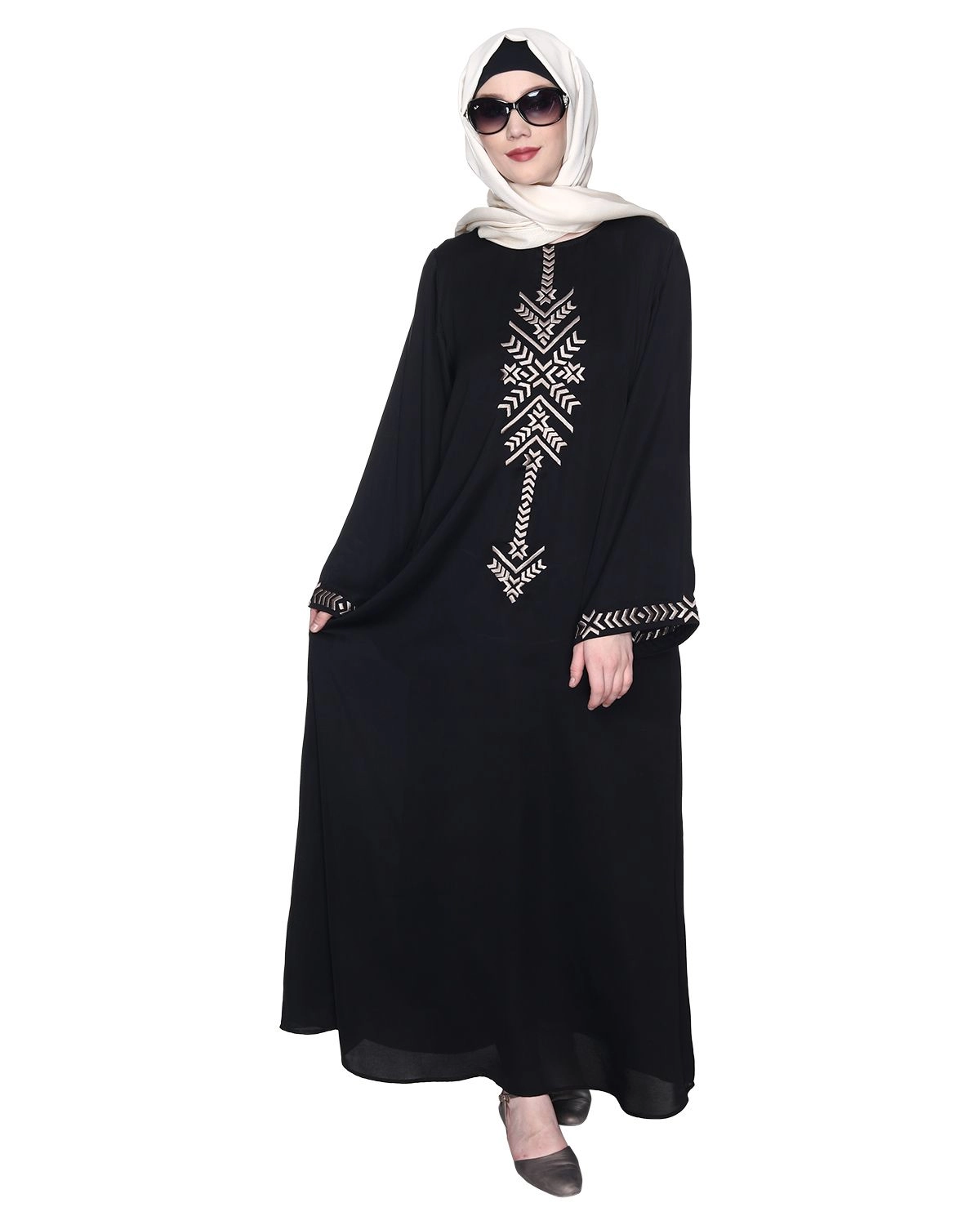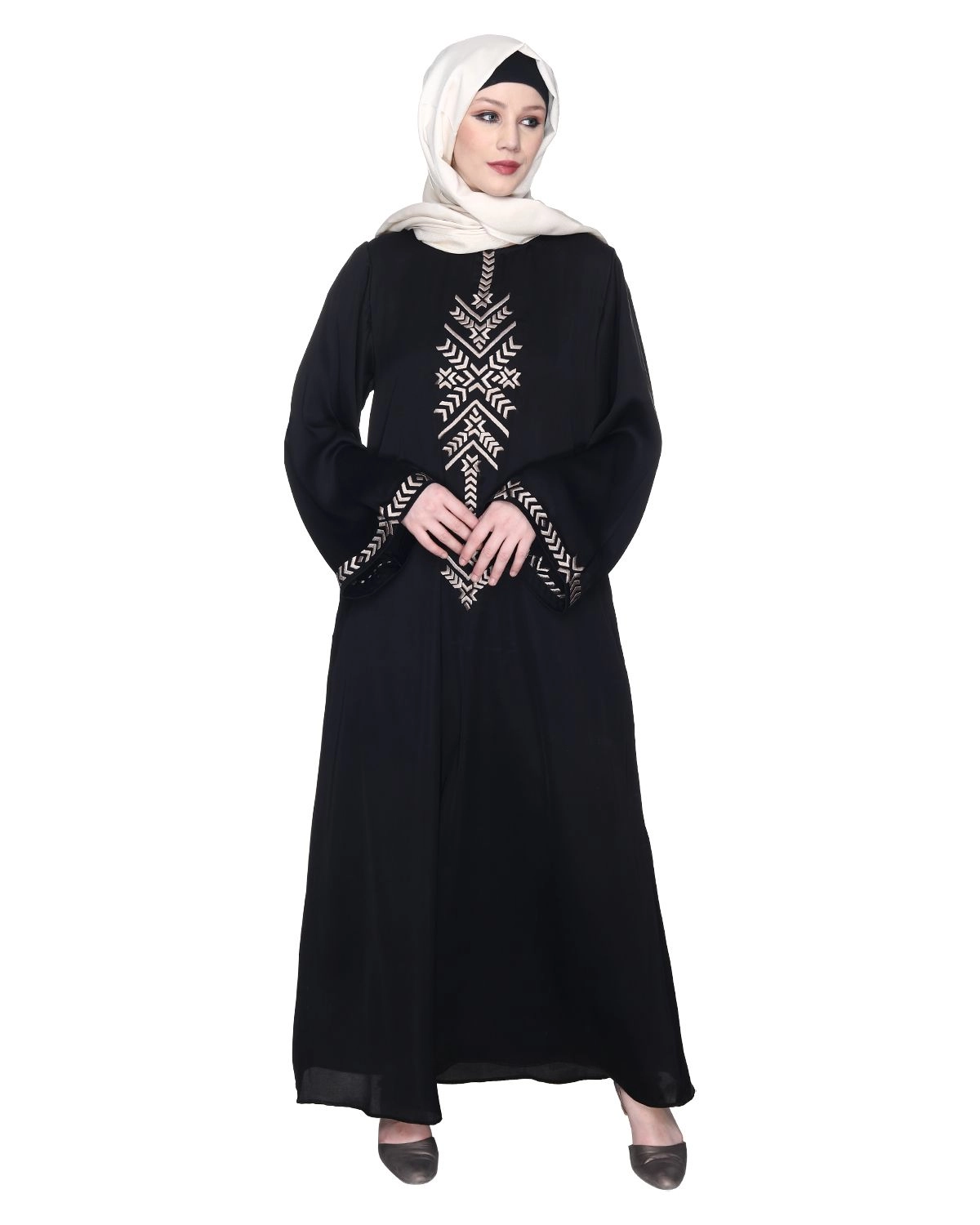 This is a premium fabric, with a slightly silky gleaming texture and is flowy, opaque, and with a great fall. It features angular resham embroidery done at the front, adding an exquisite touch to this Front Close Abaya. Please note that the item is without the accessories (Hijab) worn by the model. Colors displayed may vary slightly due to changes in lighting. For maintenance, we recommend dry cleaning only. Experience luxury and elegance with our Front Close Abaya, designed to elevate your modest fashion collection. Shop now and embrace the sophistication and style of this premium garment.