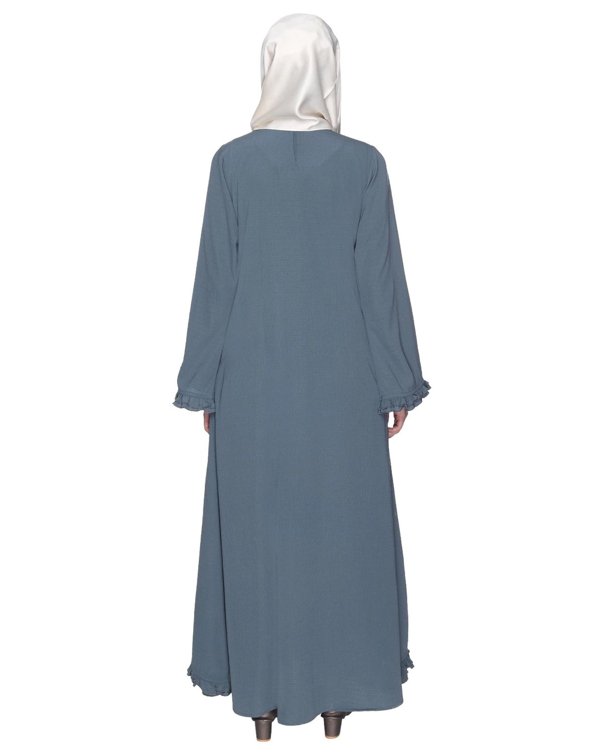 Experience luxury and comfort with our Front Close Abaya, made from premium fabric that exhibits a slightly crushed look, while maintaining a soft and pleasant feel. Crafted from high-quality polyester, this abaya is perfect for warmer seasons, offering a lightweight and breathable option that drapes beautifully and provides excellent opacity. The highlight of this garment is the stunning frill work adorning the front and sleeves, giving it a unique jacket-style look that sets it apart. Please note that the accessories, such as the Hijab, worn by the model are not included. Keep in mind that colors may slightly vary due to lighting changes. Embrace exceptional style and elegance with this remarkable Front Close Abaya, designed to make a lasting impression in your modest fashion collection.