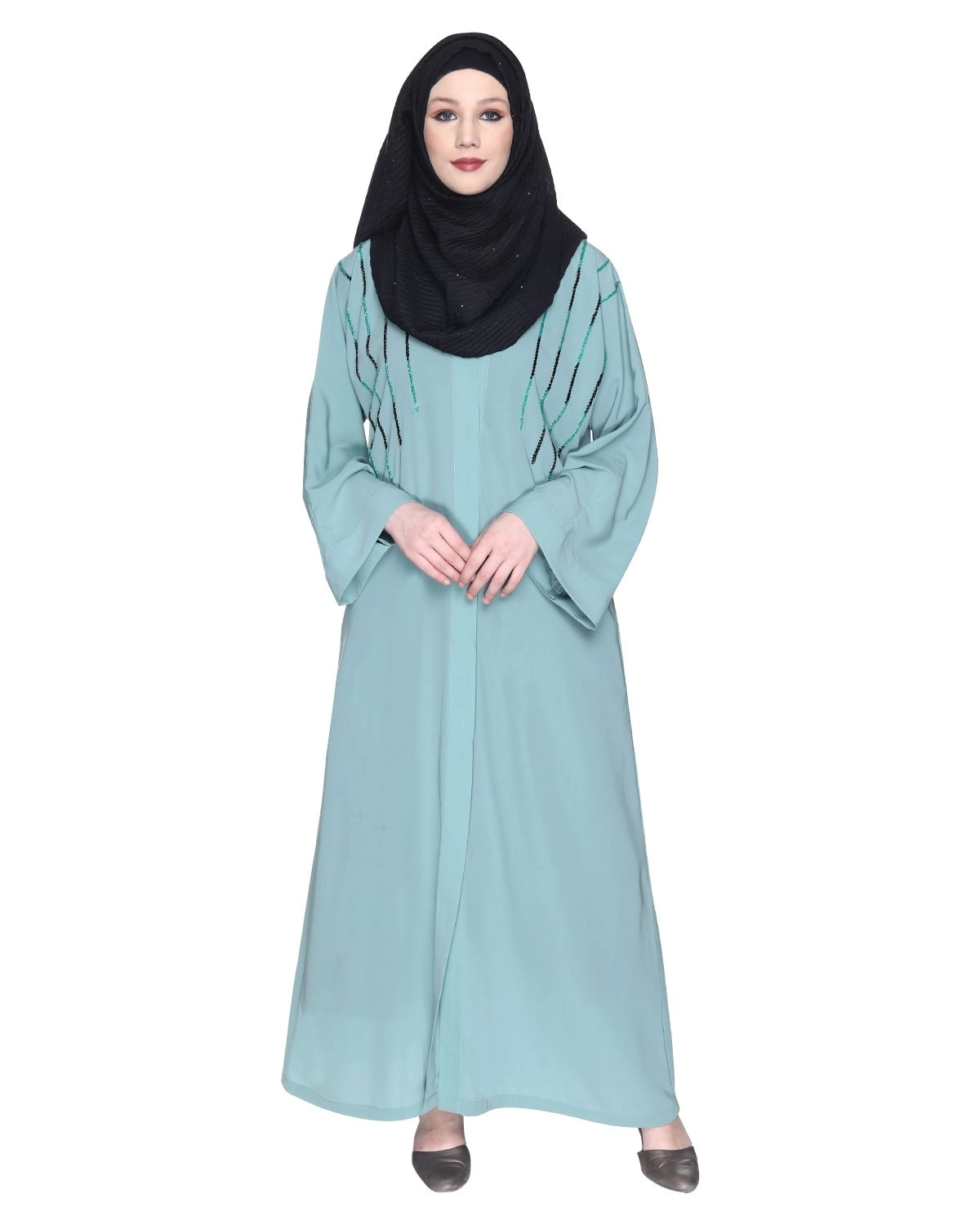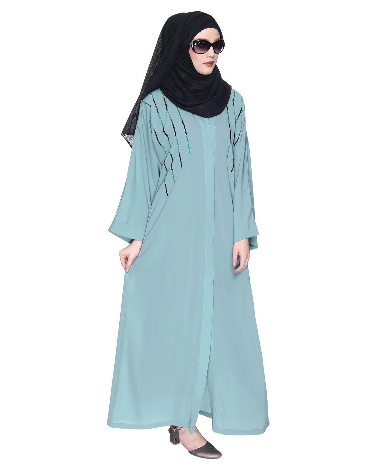 Elevate your style with our exquisite Front Open Abaya featuring a coat-style Open V Neck Collar and convenient side pockets. Made from premium fabric, this abaya offers a luxurious feel, rich texture, and a flowy, opaque silhouette with a stunning fall. The abaya is adorned with four lines of twin-shaded cut-dana hand-embroidery, adding a touch of glamour and sophistication. Please note that the accessories, such as the Hijab, worn by the model are not included. Keep in mind that colors may slightly vary due to lighting changes. Experience the perfect blend of style and modesty with this exceptional Front Open Abaya, available now to enhance your fashion statement.